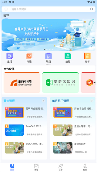 2、在主頁中可以看到各種推薦的課程以及生活技能的入口;