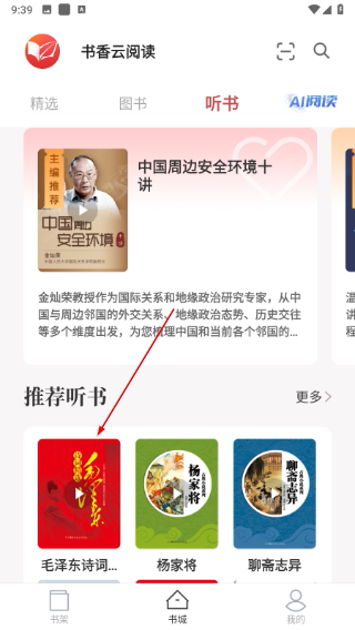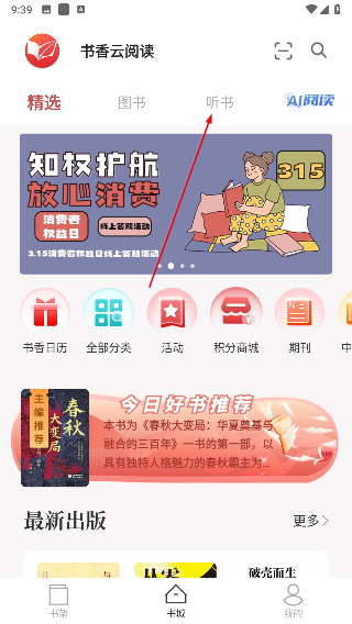 1、打開(kāi)微書房,點(diǎn)擊導(dǎo)航欄聽(tīng)書選項(xiàng),進(jìn)入聽(tīng)書頁(yè)面。